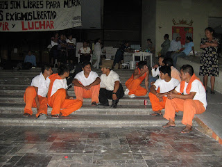 Two years ago, members of the prisoners organization “La Voz del Amate” in el Amate prison began a plantón within the prison. They camped out day and night on the prison grounds in a vocal protest of their unjust imprisonment, petitioned the state government for their release, and organized outside support through their families and activists who visited them in prison. Through their various organizational affiliations and outside support, they organized across four different prisons, including the Carcel Publica Municipal in Tacotalpa, Tabasco, where two Zapatistas are imprisoned. On February 12, 2008, Zacario Hernandez Hernandez, a member of La Voz del Amate, stepped up the protest and declared a hunger strike to demand their freedom. This sparked an escalation in the prisoners' tactics, and in the following weeks dozens more prisoners in the four jails joined the huger strike and plantónes. At its peak, 37 prisoners participated in the hunger strike with twelve more joining the plantón who couldn't hunger strike for health reasons. Many other prisoners supported the plantónistas and protected them from the prison guards.
